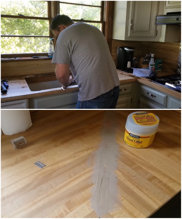 Все повреждения необходимо зашпаклевать специальной замазкой для дерева, а после высыхания отшлифовать. | Фото: youtube.com/ Lisa Capen Quilts.