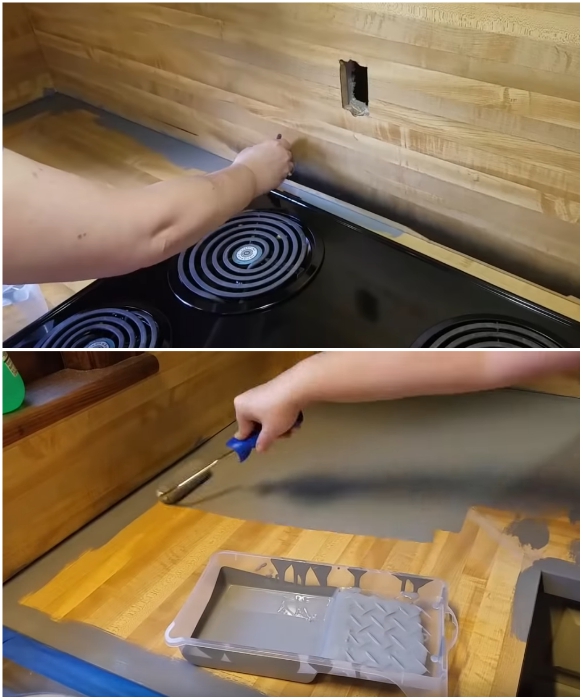 Старый кухонный гарнитур из натурального дерева решили сделать более современным. | Фото: youtube.com/ Lisa Capen Quilts.