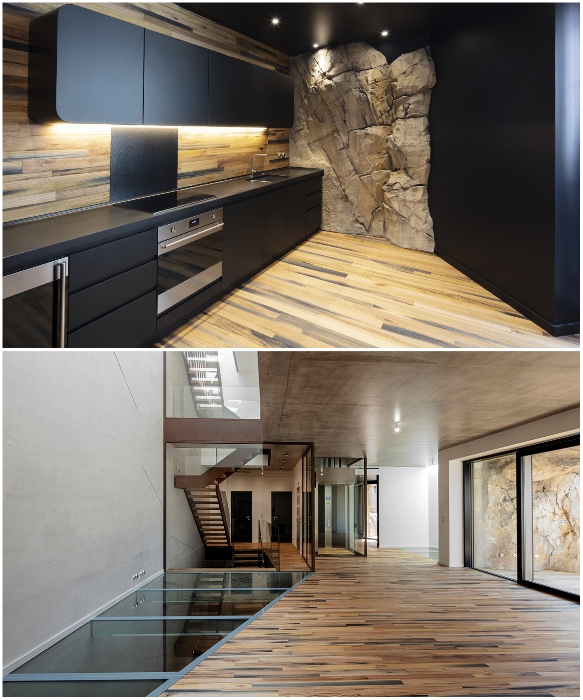 Несмотря на то, что шикарная резиденция больше похожа на пещеру с фантастическим холлом, напоминающим подземное озеро, но ее интерьер более чем современный. «Пещерные» жители обеспечены всеми благами цивилизации, причем большинство из них получены за счет внутренних ресурсов и умелого сочетания природных материалов и инновационных технологий.