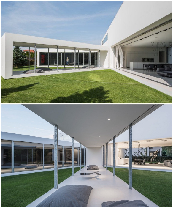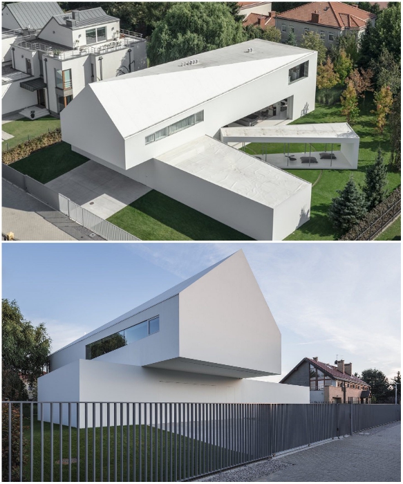 Одна из самых концептуальных и креативных архитектурных фирм KWK Promes Польши вновь объединила движение со строительными технологиями. Самый последний их проект сразил всех наповал практически полностью прозрачной террасой, которая будет «отслеживать» продвижение солнца по небу и ...двигаться вместе с ним. Белоснежный дом состоит из двух стационарных прямоугольных блоков разных размеров, один с плоской крышей, а другой с остроконечной. Эти два объекта находятся под прямым углом друг к другу. Между ними узкое остекленное «крыло» являющееся крытой террасой, в которой расположена просто невероятная гостиная, движущаяся по дорожкам над газоном.