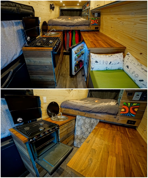 Чтобы жизнь в крошечном пространстве была не только уютной, но и безопасной для отделки было выбрано натуральное дерево, впрочем, и для создания мебели тоже. Имея крошечное пространство внутри фургона, супругам пришлось до миллиметра рассчитывать площадь, чтобы создать комфортные условия проживания.