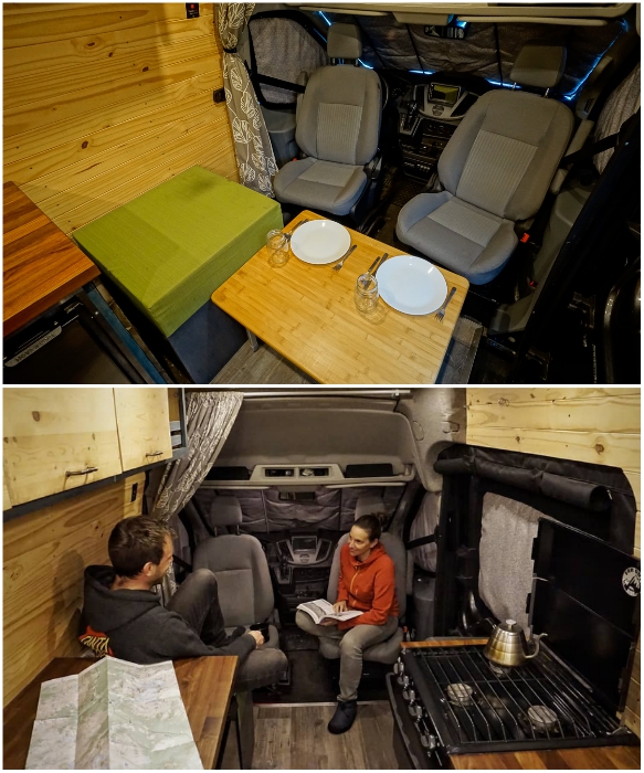 Водительское и пассажирское место оборудовали поворотными креслами, что позволяет во время трапезы развернуть их внутрь салона и пообедать/поработать с комфортом. В качестве обеденного стола они используют складной столик, который можно убрать за ненадобностью.