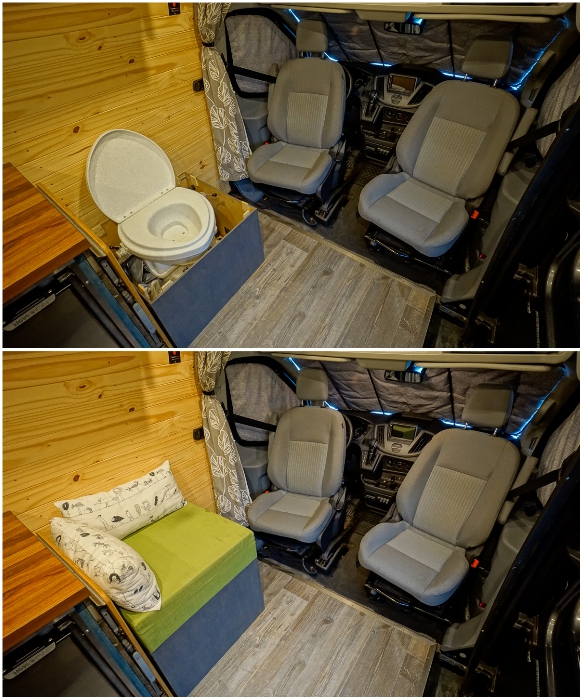 И самое главное достижение супругов в обустройстве дома на колесах – организация туалета внутри автофургона. Для этих целей была установлена компостная система, которую благополучно спрятали в деревянном коробе. В закрытом виде короб можно использовать и как дополнительное место для отдыха и в качестве журнального столика.