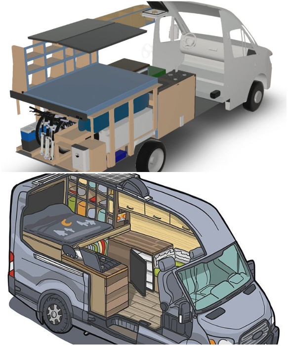 Однако, для того чтобы своими руками проводить коммуникации, делать мебель и всякие выдвижные приспособления для хранения вещей, продуктов и спортивного инвентаря, им пришлось многому научиться. Причем процесс обучения проходил прямо на «стройплощадке» (в боксе или прямо на улице), где они экспериментировали во время переоборудования автофургона Ford Transit.