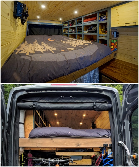 Спальное место обустроили на втором уровне автомобиля Ford Transit. | Фото: boredpanda.com.