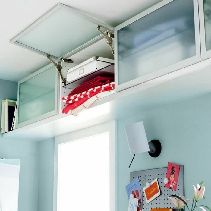 Высокие потолки являются настоящим спасением, если квартира сама по себе небольшая. С их помощью сразу можно решить все проблемы, связанные с отсутствием мест для хранения. Просто соорудите над дверными проемами полки или своеобразные ниши, и разместите там вещи, в которых вы нуждаетесь лишь время от времени. Например, сезонную одежду, постельное белье, новые полотенца, елочные игрушки и так далее. Особенно этот вариант пригодится, если все эти вещи вы обычно хранили на балконе. В этом случае, у вас освободится много места на лоджии, и вы сможете использовать ее как полноценную комнату, тем самым, расширив пространство квартиры.