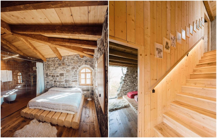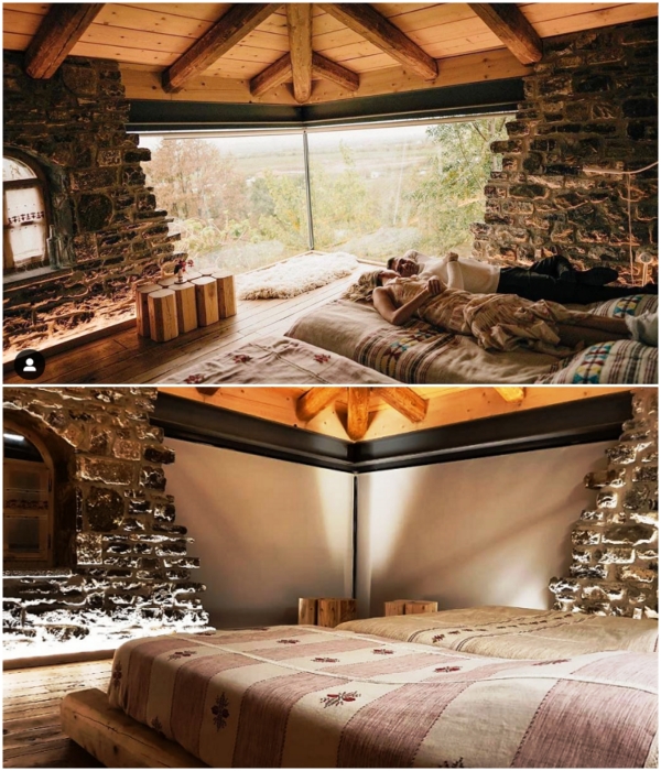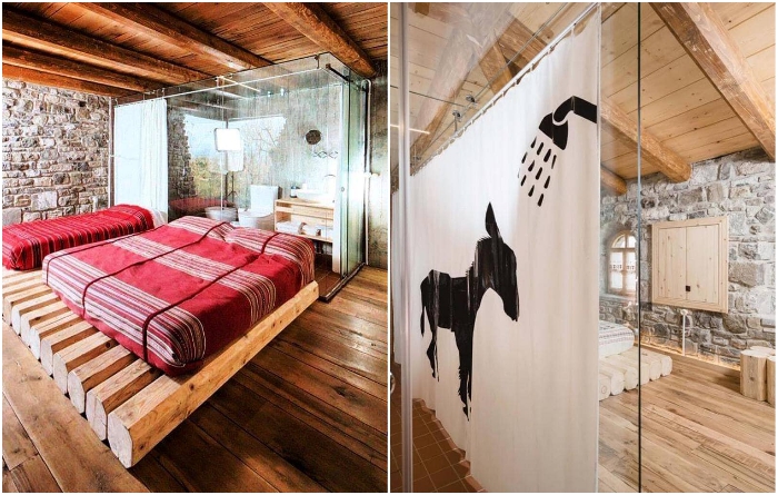 Массивные элементы из натурального дерева украшают интерьер номеров (Mrizi i Zanave Agroturizеm, Албания). | Фото: mymodernmet.com.