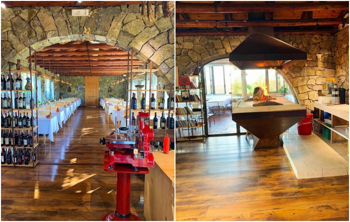 Ресторан повторяет архитектурный стиль, который использовали и при оформлении основного помещения, где расположены отельные номера. Каменные стены, деревянные сводчатые потолки с массивными балками подчеркивают местные традиции. При этом в интерьере используется много стекла, а в тандеме с белыми скатертями и изысканными столовыми приборами он полностью соответствуют современным требованиям гостеприимства подобных заведений.