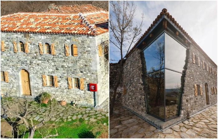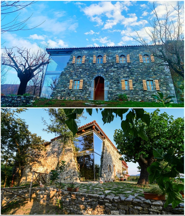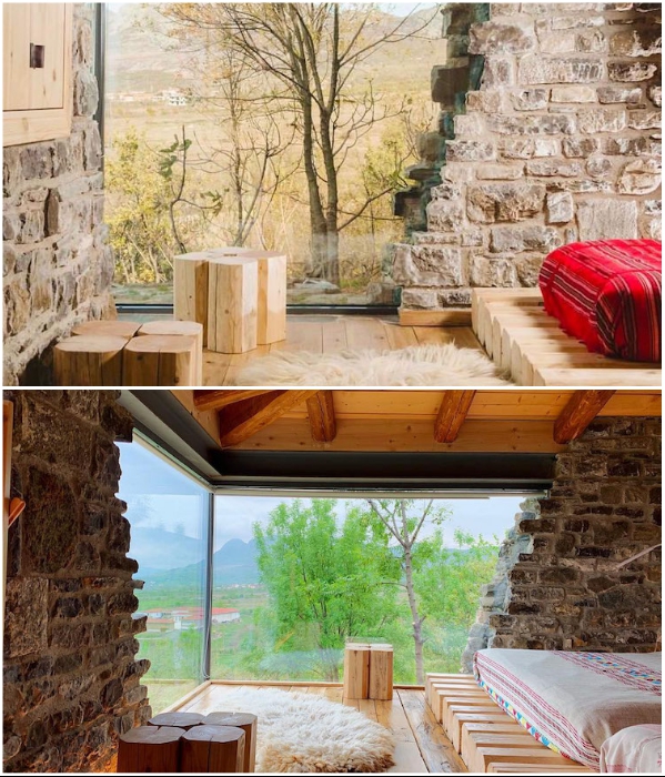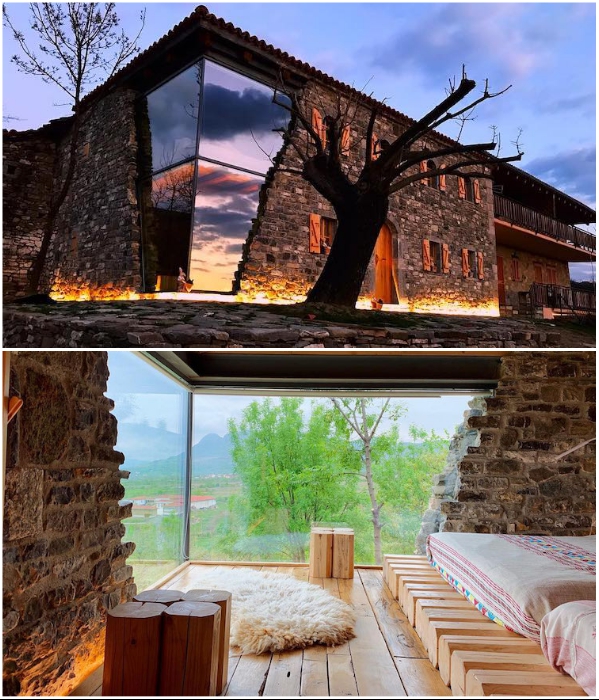 В итоге гостевой дом с большим внутренним двором был построен из натурального камня местных пород. Если смотреть на него с одного угла, то ничего сверхординарного не увидите, ведь он создан в лучших сельских традициях Албании – полностью каменный фасад, крошечные окна с деревянными простенькими ставнями. Но другой угол основного здания сделан из высокопрочного стекла и если смотреть издалека, то возникает стойкое ощущение, что часть дома просто разрушена.