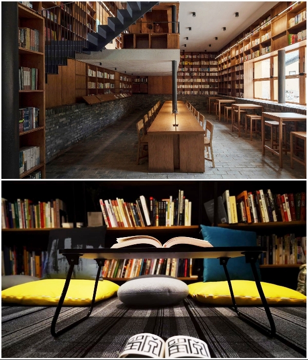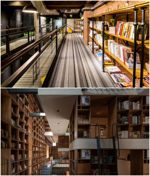 Общие лаунж-зоны необычного отеля тоже заставлены полками и стеллажами с книгами («Liuyue Capsule Hotel», Китай). | Фото: worldarchitecture.org.