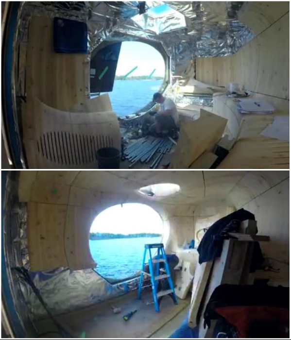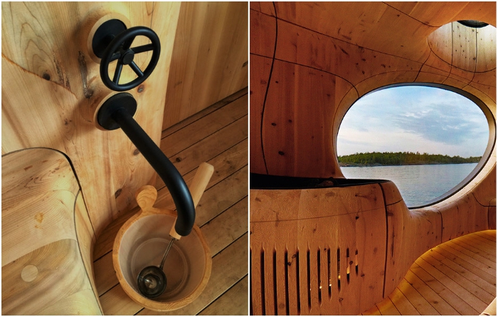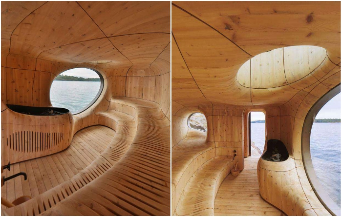 Если подходить к сауне со стороны скалистого берега, то взору открывается обычный деревянный короб, созданный из обожженных досок кедра с овальными окнами даже на крыше, но попав внутрь, ни одного угла или ровной линии и не найдешь.