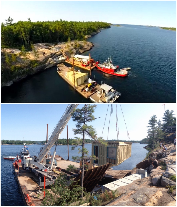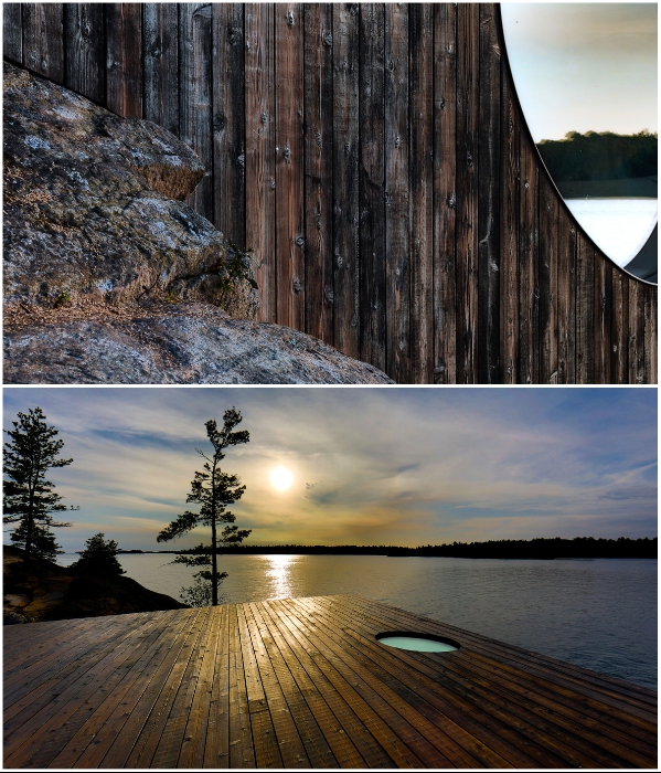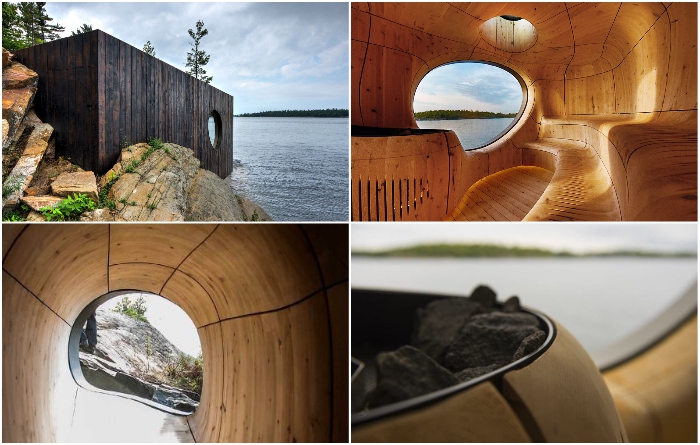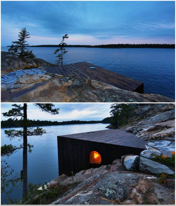Фасадная часть сауны была собрана на заводе и водным путем доставлена на нужное место («Grotto», Канада). / Фото: partisans.com.