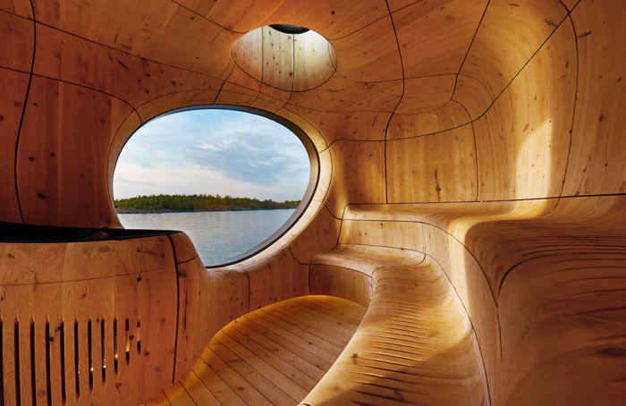 На берегу канадского озера San Souci появилась чудо-сауна, интерьер которой больше напоминает скульптурное пространство («Grotto»). hqroom.ru. Как правило, у большинства любителей попариться в сауне во время нахождения внутри парилки дух захватывает от высокой температуры и обжигающего жара, а не от красоты интерьера. Но бывают и исключения, так например, на территории частного острова Санс Сауси (Sans Souci) (канадская сторона озера Гурон), появилось вполне обычное с виду строение с прямым доступом к воде. Оно оказалось сауной, которую спроектировала команда дизайнеров из архбюро Partisans.
