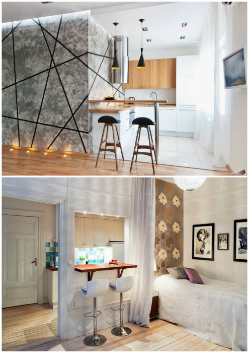 Идеи, к которым стоит присмотреться всем владельцам маленьких студий. На сегодняшний день набирают все большую популярность квартиры-студии. Их продают в новостройках или же переделывают из хрущевок. У такой планировки есть как сторонники, так и противники. Мы же сегодня рассмотрим, как правильно обустроить квартиру-студию, чтобы сделать ее максимально комфортной. 1. Барная стойка на границе зон Барная стойка служит для разграничения пространства. | Фото: Roomble.com, ReRooms. Сама по себе квартира-студия подразумевает отсутствие границ, но отсутствие стен и порогов совсем не означает, что вам не придется зонировать свое пространство. Сперва вам может показаться, что в этом нет ничего сложного, но на деле вы столкнетесь с рядом проблем. Первое, что нужно учесть, расставляя границы, - пространство должно казаться целостным и гармоничным. Второе: помещение должно быть четко структурированным. Третье: каждая зона должна выполнять определенные функции. Если речь идет о разграничении комнаты и кухни, в качестве границы можно использовать барную стойку. Этот предмет мебели зачастую прекрасно вписывается как в концепцию гостиной, так и в интерьер кухни. 2. Зонирование цветом Зонирование квартиры с помощью цвета и фактуры. | Фото: Hochu.ua, mir-krasok.tagster.club. Еще один способ зонирования пространства подразумевает использование разных цветов и фактур. Главное при этом - подобрать два контрастных, но сочетающихся между собой цвета или материала. По мнению Novate.ru, очень здорово выглядят сочетание дерева с белой или серой краской. Также можно использовать яркую плитку в комплексе с однотонными светлыми обоями. Если хотите создать уютный уголок для отдыха, поклейте там темные обои с элегантным узором, а для оформления оставшейся площади используйте светлый однотонный материал. 3. Мебель Мебель, размер которой имеет значение. | Фото: Дизайн Эксперт. Многие владельцы квартир-студий выбирают маленькую мебель, тем самым совершая грубую ошибку. Другие, наоборот, стараются ограничится минимальным набором вещей, но, обычно, громоздких, что тоже неверно. Всем владельцам маленьких квартир, причем не только открытого типа, дизайнеры рекомендуют придерживаться золотой середины и подбирать мебель в соответствии с ростом жильцов, а также высотой потолков и общей площадью. Что касается квартир-студий, в них важно сохранить максимальное количество свободного пространства, а значит ограничиться только самым необходимым минимумом. 4. Концепция Концептуальный интерьер. | Фото: Homify, setyouroom.com. Чаще всего владельцами квартир-студий становятся молодые пары без детей, холостяки или бизнес-леди. Все эти категории могут позволить себе проявить креативность и сделать свое жилье стильным и концептуальным. Для этого определите, какой из современных стилей нравится вам больше всего и придерживайтесь его основных характеристик. Любите брутальность и драматизм - обратите внимание на интерьеры в стиле лофт или индастриал. Любите свет и легкость - тогда вам придется по душе минимализм, прованс, контемпорари или европейский. 5. Спальный бокс Спальня отдельно. | Фото: la-mini-maison.com, Stroychik.ru. Открытая планировка кухни и гостиной - обычное дело для современных квартир, но свое спальное место всегда хочется спрятать. Сделать это в квартире без стен проблематично, но все же возможно. Для создания 