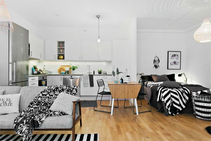 Мебель, размер которой имеет значение. | Фото: Дизайн Эксперт. Многие владельцы квартир-студий выбирают маленькую мебель, тем самым совершая грубую ошибку. Другие, наоборот, стараются ограничится минимальным набором вещей, но, обычно, громоздких, что тоже неверно. Всем владельцам маленьких квартир, причем не только открытого типа, дизайнеры рекомендуют придерживаться золотой середины и подбирать мебель в соответствии с ростом жильцов, а также высотой потолков и общей площадью. Что касается квартир-студий, в них важно сохранить максимальное количество свободного пространства, а значит ограничиться только самым необходимым минимумом.