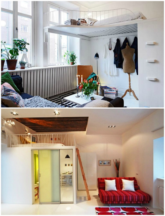 Кровать на втором этаже. | Фото: Mebel-Go.ru, Квартира-студия.ру. Если высота потолков вашей квартиры позволяет, соорудите импровизированный второй этаж. Небольшое пространство под потолком прекрасно подойдет для обустройства уединенного спального места. Однако перед тем, как реализовывать данную идею, подумайте, сможете ли вы спать в столь ограниченном пространстве.