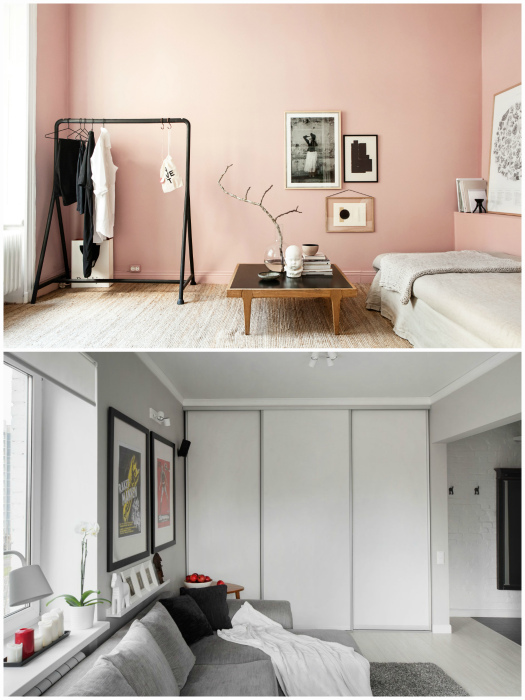 Зонирование квартиры с помощью цвета и фактуры. | Фото: Hochu.ua, mir-krasok.tagster.club. Еще один способ зонирования пространства подразумевает использование разных цветов и фактур. Главное при этом - подобрать два контрастных, но сочетающихся между собой цвета или материала. По мнению Novate.ru, очень здорово выглядят сочетание дерева с белой или серой краской. Также можно использовать яркую плитку в комплексе с однотонными светлыми обоями. Если хотите создать уютный уголок для отдыха, поклейте там темные обои с элегантным узором, а для оформления оставшейся площади используйте светлый однотонный материал.