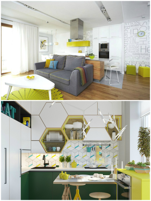 Яркие акценты в интерьере. | Фото: Behance. Возможно, вам это покажется банальным, но для оформления квартир-студий лучше всего использовать светлые оттенки. Белый, мятный, бледно-желтый, светло-серый и другие цвета пастельного спектра способны визуально увеличивать пространство, создавая ощущения легкости и воздушности. Ну, а для того, что интерьер не выглядел скучно и уныло, добавьте ярких деталей: кресла, полочки с цветными стенками, диванные подушки, ковры и другие мелочи.