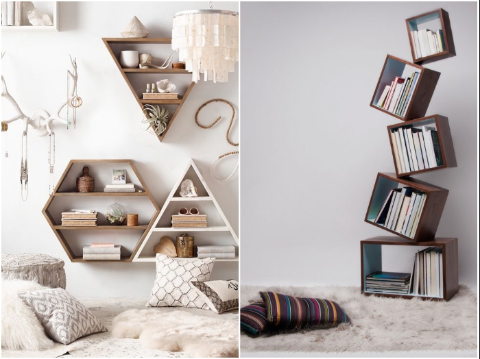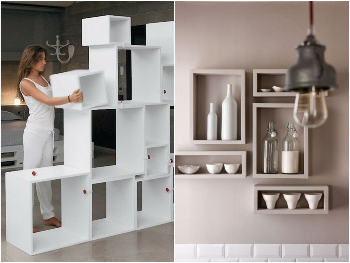 Совет от Novate.Ru: Если решите для этих целей купить или сделать собственноручно полку, то лучше отдавать предпочтение необычным формам и интересным материалам — вариантов масса, но не стоит забывать о том, что любой объект должен органично вписаться в дизайн. 4. Возможность комбинировать разные модули и делать необычные композиции