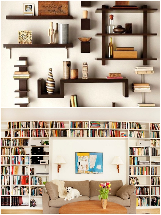Полки могут быть и основным акцентом в интерьере и даже арт-объектом. | Фото: indesigninfo.ru/ domnomore.com.
