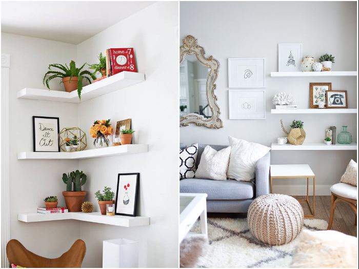Если в комнате уже есть акцентные элементы лучше использовать незаметные открытые полки. | Фото: roomester.ru/ roomble.com.