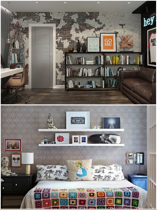 Если хотите сделать акцент именно на этом предмете интерьера, тогда следует выбирать дизайнерские модели и необязательно покупать их за баснословные деньги, достаточно модернизировать имеющиеся в наличии полки. Для этого порой достаточно будет покрасить заднюю стенку или сам каркас в контрастный/яркий цвет.