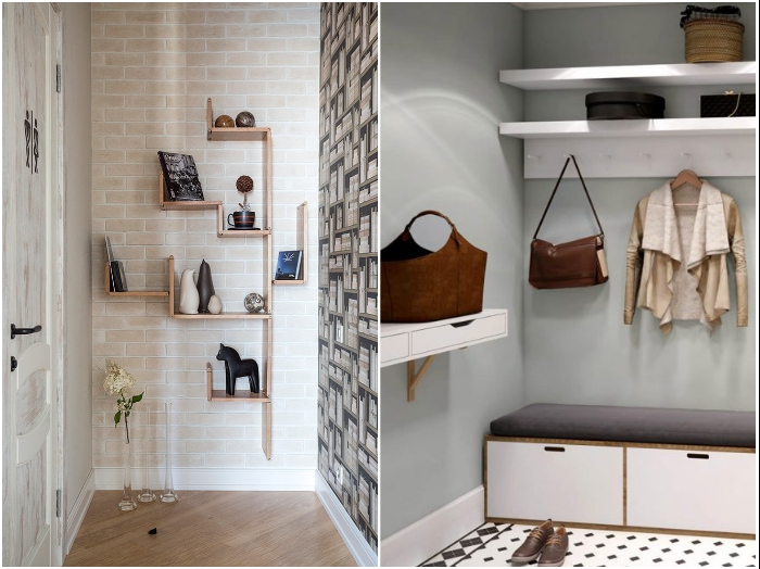 Открытые полки в интерьере прихожей/коридора одинаково хорошо смотрятся и как украшение, и как место для хранения вещей. | Фото: dizainexpert.ru/ dekormyhome.ru.