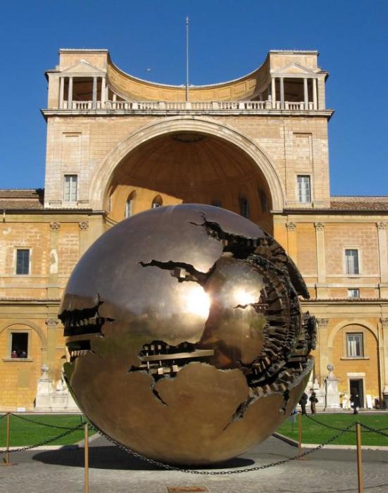 Необычная покупка папы Римского. /Фото: interest-planet.ru Эта инсталляция находится в центре Двора Пинии и является приобретением папы Иоанна Павла II от 1990 года для своей резиденции. Ее автор - итальянский скульптор Арнальдо Помодоро.