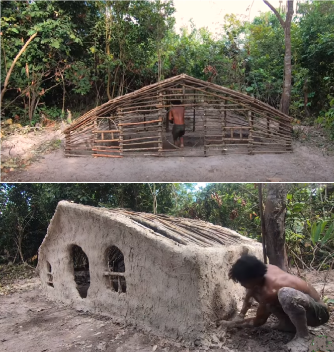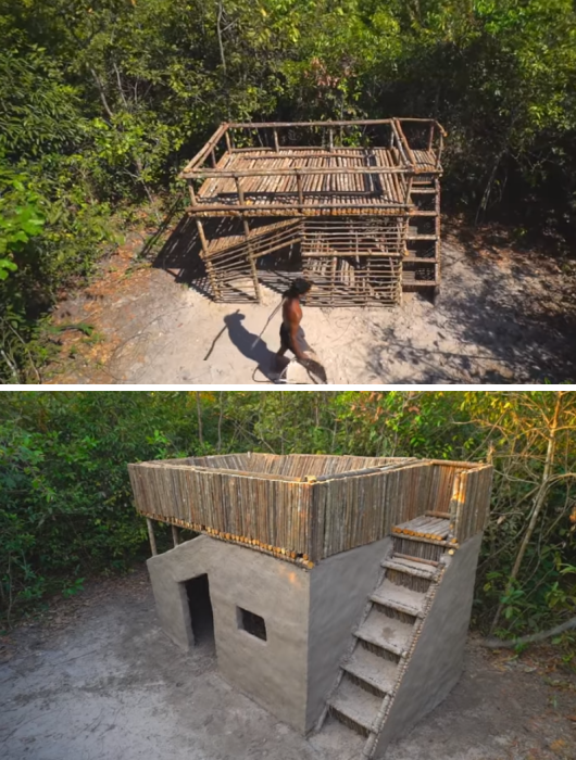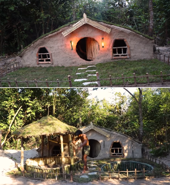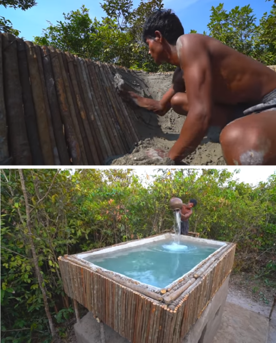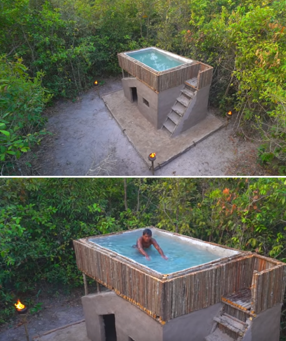 Используя ветки деревьев, стволы бамбука, глину и солому, камбоджийский мастер сделал каркас и стены. После полного высыхания своеобразной отделки ему пришлось таскать воду глиняным сосудом, чтобы наполнить бассейн, но результат того стоил. Такими действиями он в очередной раз доказал, что, если руки растут откуда надо и есть мыслящая голова, можно создать жилье на подобии виллы и наслаждаться жизнью даже в джунглях.
