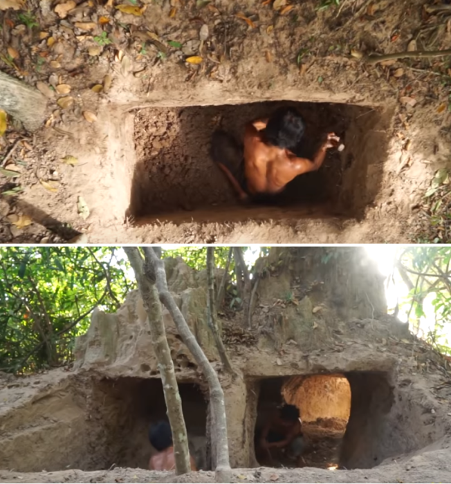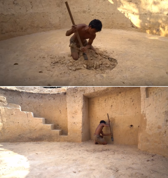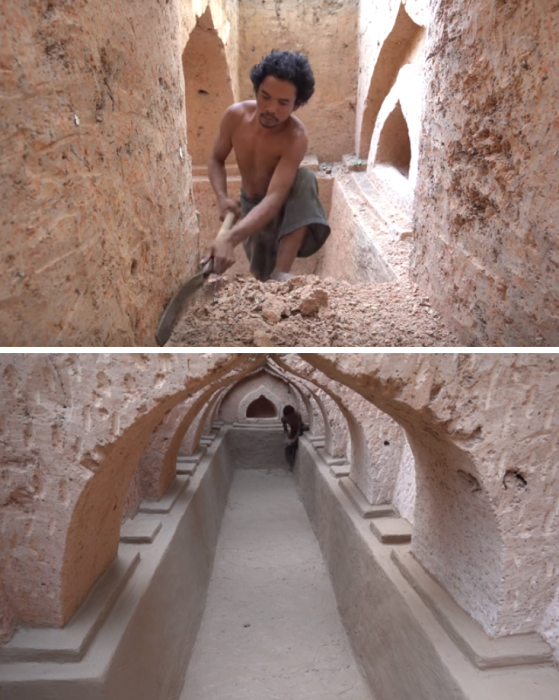Глядя на этого парня, который в одиночку сделал подземный дворец, сложно не восхититься талантом и сноровкой. Используя древние знания, он самостоятельно вырубил в земле туннель с настоящими резными сводами, в одной из ниш которого обустроил камеру с земляным лежаком.