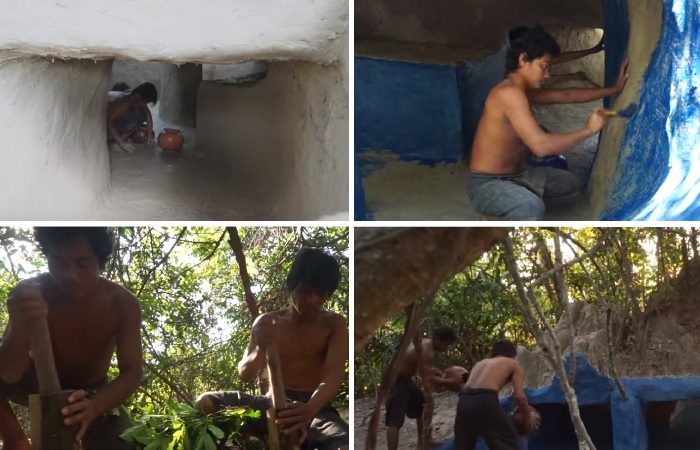 Используя все тот же инструмент, двум молодым ребятам удалось создать настоящую земляную пещеру, которую заполнили водой так, чтобы лежаки были над ней. Для того чтобы сделать пребывание под землей более запоминающимся, стены покрасили в синий цвет, добыв его так, как это делали древние люди. Ребята нашли нужное растение и извлекли из его листьев сок с помощью ступы, сделанной из куска полой ветки бамбука и более твердой палки вместо песта.