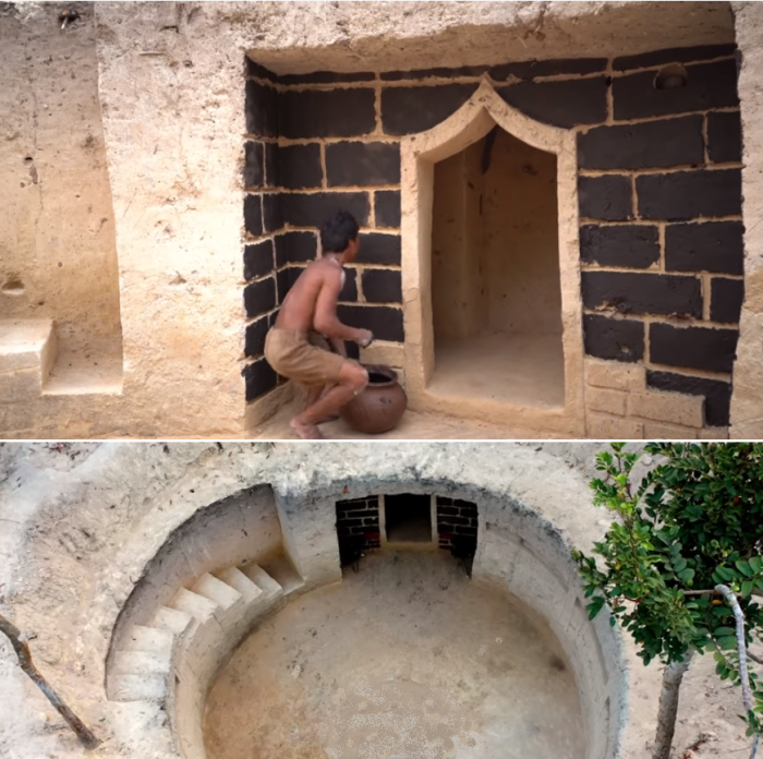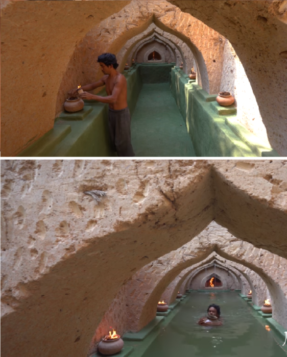 Чтобы создать иллюзию изумрудной воды, нижнюю часть котлована и боковые стены он покрасил с помощью растительной краски. По-видимому парень романтик и в такие апартаменты планирует приглашать подругу, иначе бы не стал украшать фантастический туннель оригинальными факелами в глиняных сосудах. Теперь у него будет прохладное и безопасное убежище, но скорее всего оно прослужит до первых муссонных дождей, ведь над сводами туннеля нет крыши.