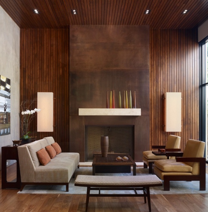 Наверное, «деревянные» – это громко сказано. Больше подходит обозначение «псевдодеревянные», так как натуральный материал стоил недешево. Этот тренд пришел к нам с Запада, где он обрел популярность в 70-х годах прошлого века. В России он стал востребован в 90-х, однако ненадолго. Дело в том, что подобная отделка стен, особенно, если использовались темные материалы, делала комнату в несколько раз меньше и очень сильно «давила». Хотя многие люди и не хотели это признавать, так как искренне считали, что деревянные панели придают квартире солидности и роскоши. Возможно, это так и было, но лишь в том случае, если жилье отличалось большими габаритами. Сейчас этот тренд существенно изменился и превратился в моду на акцентную стену. Причем, актуальным цветом стал не коричневый, а насыщенные синий и зеленый.
