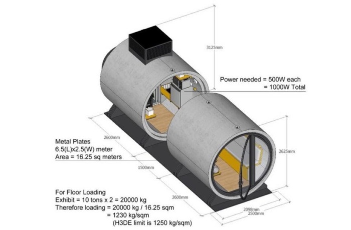 Схема размещения зон и технические характеристики микродома из железобетонной трубы (OPod Tube House, Гонконг). | Фото: bigpicture.ru.
