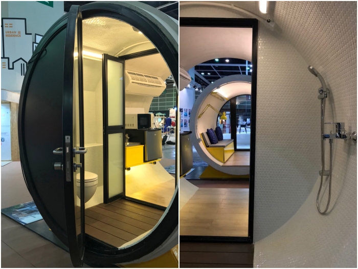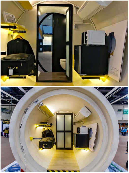 Тестируют полностью оборудованные мини-домики площадью 9,3 кв.м. состоящие из гостиной, которая превращается в спальню благодаря раздвижному дивану или в кабинет, когда он сложен. Также ее можно использовать и как обеденную зону. OPod Tube House еще оборудован небольшой гардеробной где хранятся вещи и установлен небольшой холодильник, мойка, стол-тумба и микроволновая печь, в том числе полноценной душевой и туалетом.