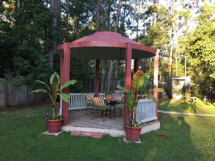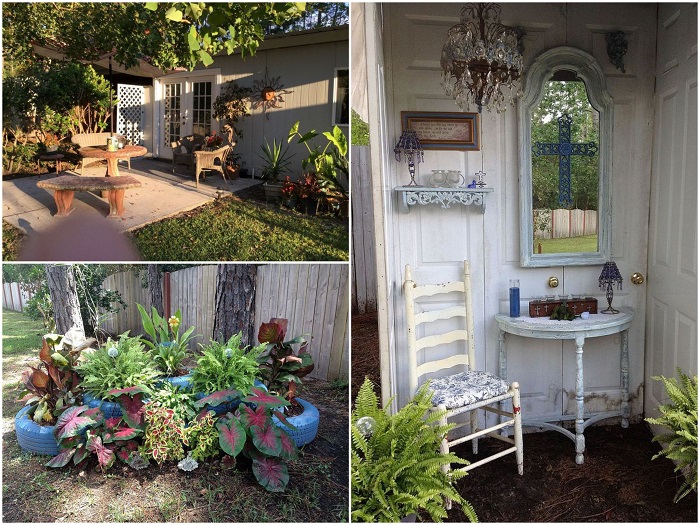 Именно беседкой женщина особенно гордится, ведь ее способность творчески мыслить и склонность к экспериментам привели к гениальной идее. Когда на радиостанции, на которой работает ее супруг, поменяли спутниковую антенну, Дебби попросила его принести домой отправленный в утиль отражатель в виде тарелки. Сначала мужчина подумал, что она сошла с ума, но изобретательная хозяйка превратила этот металлический круглый элемент довольно большого диаметра …в крышу беседки. Для этого оставалось лишь установить несколько опор и на них закрепить перевернутую спутниковую «тарелку» верх тормашками и закрыть отверстие по центру.