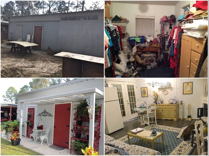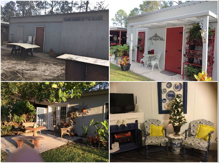 Дебби с супругом для начала решили облагородить фасад сарая, который буквально за 2 недели превратился в довольно привлекательное строение. Небольшая терраса с решетчатой деревянной крышей, зелень у порога преобразили их загородный домик, и теперь даже никто подумать не мог, что это был заброшенный сарай. Чтобы максимально сэкономить на отделке, стройматериалы они покупали по дешевке на интернет-портале CraigsList.org или в сети магазинов Habitat ReStores.