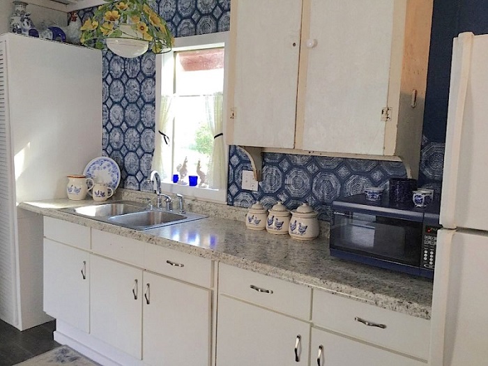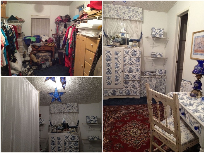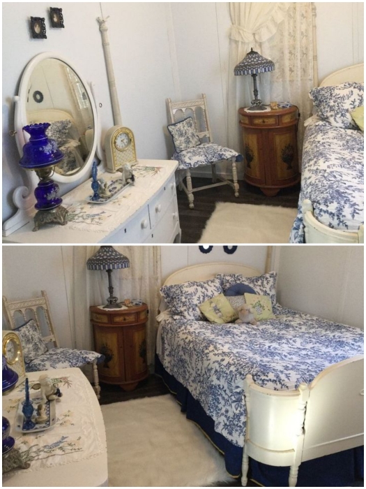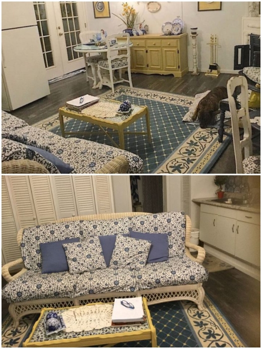 Немало элементов супруги создали сами, например, оригинальное панно из тарелок внутри рамы, консоль из куска старой двери и ножек, найденных на свалке. Обивку подержанной мебели, давно потерявшей свою привлекательность, Дебби обновила с помощью белой ткани с ярко-синим рисунком. Для разнообразия добавила пару тройку ярких декоративных подушек, также в некоторых зонах повесила большие синие звезды.