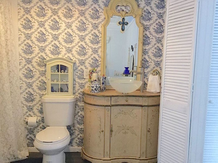 Старинный туалетный столик приспособили под рукомойник, а деревянной перегородкой отделили ванную с санузлом от жилой зоны. | Фото: fanpage.gr.