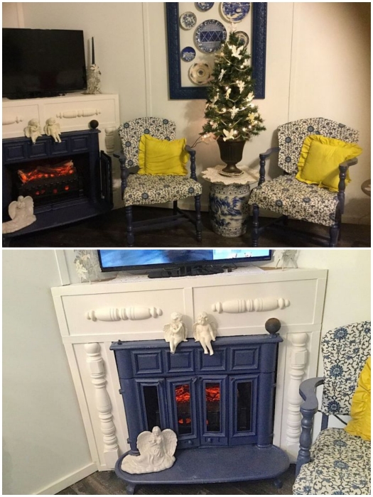 Особый элемент декора камин был создан из передней панели, которую отдали предыдущие владельцы участка, а внутреннюю часть занимает обычный электрический обогреватель с открытой спиралью, создающей иллюзию огня.
