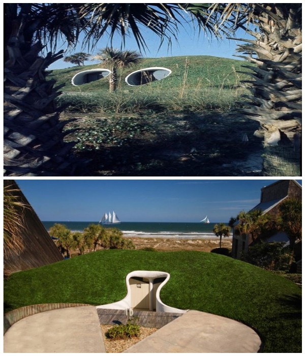 Непонятное существо с огромными глазами маскирующееся под зеленый холм напугает кого угодно, особенно если резко взглянуть в пустые глазницы чудовища. Но не все так страшно как кажется на первый взгляд. Как оказалось, это творческая фантазия американского архитектора Уильяма Моргана – вилла Dune House, созданная еще в 1975 г. Столь экстравагантно творец замаскировал подземный особняк на побережье Атлантического океана. Несмотря на то, что этот объект идеально вписался в окружающую среду, он явно не соответствует неписаному пониманию того, как должен выглядеть «красивый» архитектурный объект на берегу океана.