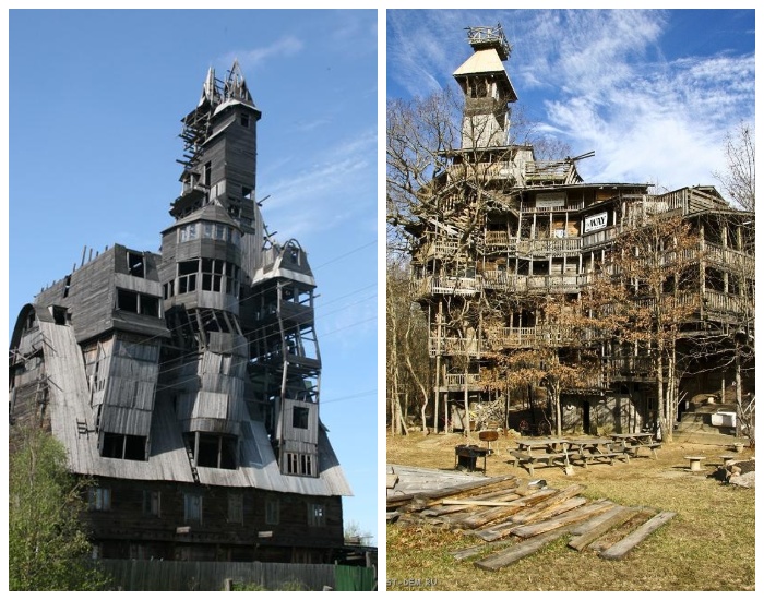 Соединить не соединяемое попытался архангельский бизнесмен Николай Сутягин. Чтобы попасть в Книгу рекордов Гиннеса он решился на строительство 13-ти этажного деревянного небоскреба с башнями, достигающими 44 м. высоты. В итоге получился причудливый фантасмагорический объект, больше походивший на логово злодея, нежели на прекрасный замок созданный по старинным технологиям. К сожалению, судьба столь необычного строения оказалось печальной, помимо того, что деревянный небоскреб заставили разобрать аж до 4 этажа, так в последствии его оставшаяся часть практически вся сгорела. Но этот необычный объект с необъяснимым сочетанием стилей из разных культур был настолько популярен, что пару лет назад во Франции воссоздали деревянный небоскреб только в виде макета.