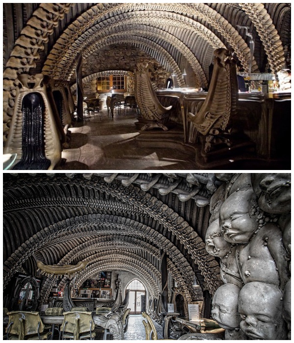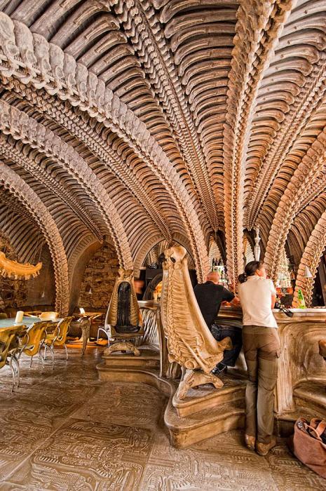 Странное ощущение охватывает посетителей одного из баров-музеев в Грюйере, что в Швейцарии. Само по себе творение Гигера (H.R. Giger) является впечатляющим произведением скульптурного искусства, можно сказать даже идеальным как для музея. Но учитывая, что он одновременно является и местом общественного питания, так сложно даже себе представить, как кусок в горло полезет среди такой массы до ужаса реалистичных позвоночников, ребер и костей гигантских животных и фантастических существ.