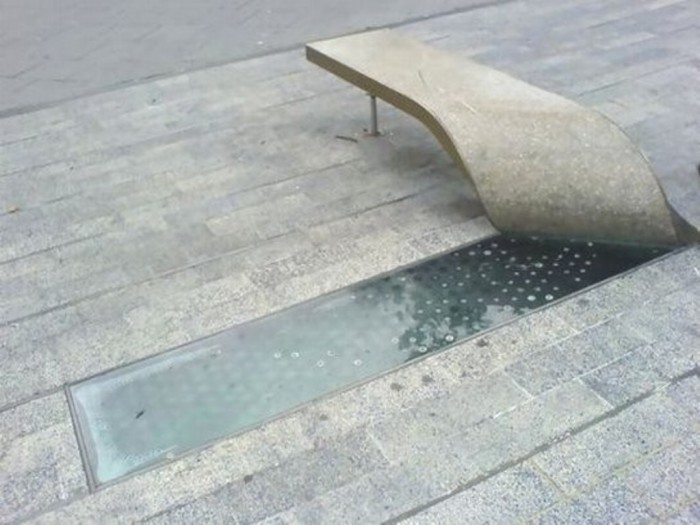 Такой привычный атрибут городских улиц, как скамейки мало, кто замечает. Их начинают искать глазами только тогда, когда хочется передохнуть. Но столь неприметный объект городской архитектуры тоже может вызвать недоумение. Особенно, если человек видит этот шедевр дизайнерской мысли впервые. У любителей порядка сразу же возникает непреодолимое желание ее починить, ведь вид у этой скамьи такой, будто кусок тротуара оторвался и загнулся вверх. При этом на месте отрыва вставлено стекло, создавая визуальный провал, что еще сильнее усугубляет ситуацию. Это произведение можно найти возле галереи Laing Art в Ньюкасл-апон-Тайн в Великобритании. Оно является частью художественной инсталляции под названием «Голубой ковер». Его спроектировал Томас Хезервик в середине 90-х гг. прошлого века и с тех пор не прекращаются споры среди местных жителей. Они в равной степени любят и презирают такой шедевр.