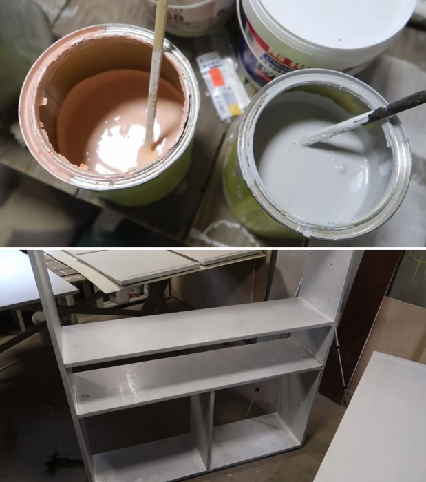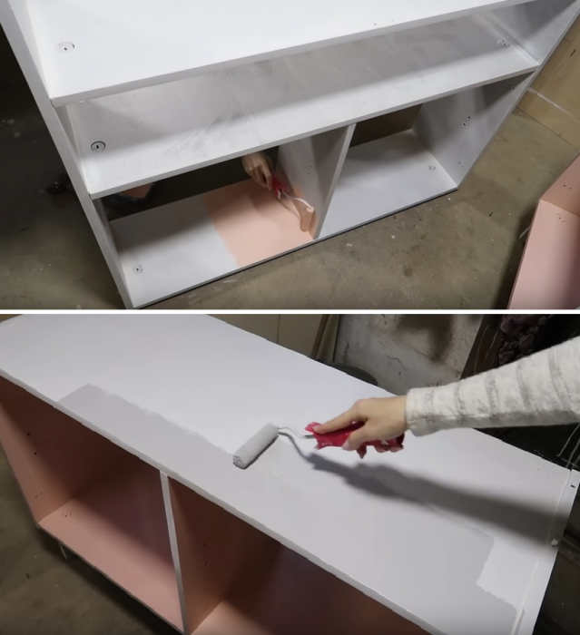 Поскольку секретер предназначается для дочери Надежды девушки, решили, что внутренняя часть будет нежно персикового цвета, а фасады, просвет и торцы – бледно-серого. Чтобы краска смотрелась более плотной и однородной, нужно вскрывать в 2-3 слоя, при этом каждому слою необходимо дать время на полное высыхание.