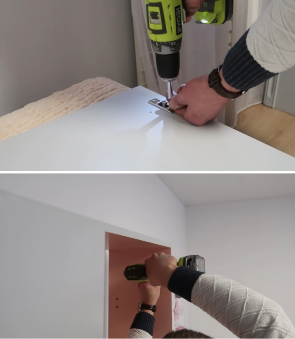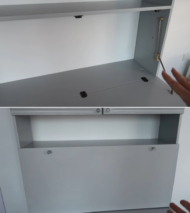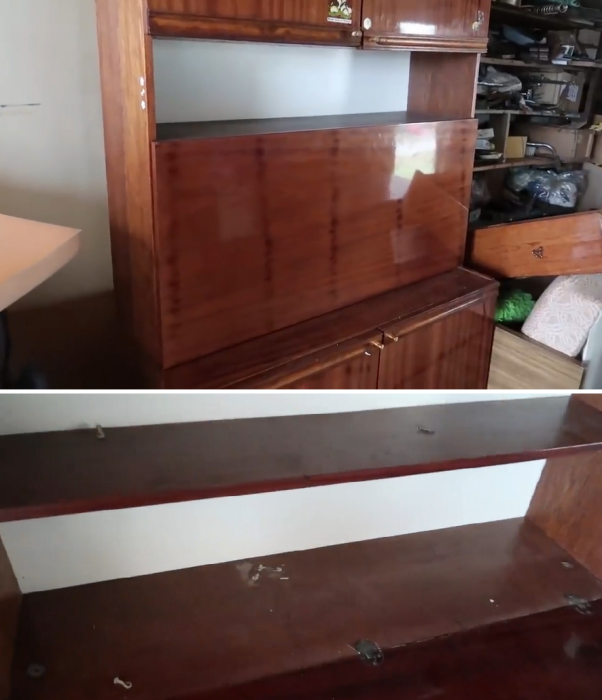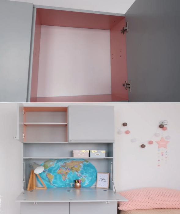После сборки конструкции секретера мастерице захотелось добавить функциональности и цвета, поэтому она поместила на заднюю стенку рабочей зоны политическую карту мира и сделала отверстия для проводов, чтобы подключить настольную лампу. Поскольку Надежда обустраивает комнату для своей дочери – это не первая ее переделка старой советской мебели. До этого она обновила платяной шкаф и кровать, которая превратилась с комфортное ложе для маленькой принцессы.