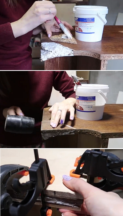 В том случае, если есть повреждения или сильные сколы и отломанные части сохранились, то их можно приклеить на место. Для этого понадобится строительный клей ПВА, который отличается повышенной клейкостью и густотой (от канцелярского). После того как тщательно очистили поврежденные половинки от пыли и мусора, нужно хорошенько промазать все образовавшиеся трещины и поверхности. Чтобы обломанная часть более плотно вошла на старое место, лучше постучать по краям киянкой. Затем взять две небольших ровных дощечки, приложить из с двух сторон отреставрированного угла и зажать струбцинами. В таком положении оставить до полного высыхания.