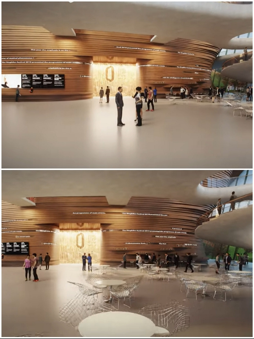 Новый же театр будет иметь общую площадь около 35 тыс. кв. м, что позволит оформить сразу две сцены – большую, рассчитанную на 1300 посадочных мест, и малую – для 800 зрителей. Помимо колоссальной площади, театр планируют оснастить по последнему слову техники, ведь на данный момент, чтобы подготовить сцену к очередному спектаклю, нужно потратить целых 3 дня и столько же, чтобы провести демонтаж декораций. В новом же здании разработчики обещают, что на эти действия будет уходить всего лишь несколько часов. А это значит, что можно будет чаще менять репертуар и увеличить количество спектаклей. Современные театры и культурные центры, созданные в последние годы, поражают своими фантастическими формами и неограниченными техническими возможностями. Не стал исключением и Международный центр культуры и искусства «Мэйсиху» в Китае, который спроектировало архбюро бессмертной Захи Хадид.