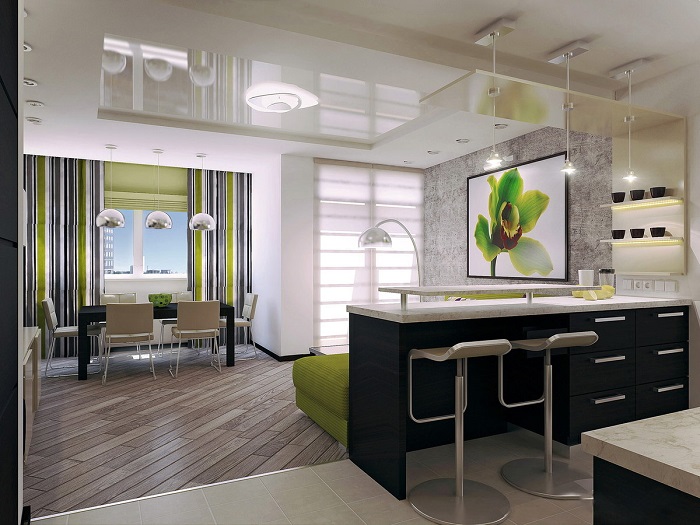 Разделение может быть визуальным или физическим. В первом случае кухня будет более просторной, так как ее пространство ничем не ограничится. Границу можно обозначить при помощи контрастной цветовой гаммы: например, постелить разные полы на кухне и в гостиной или провести зонирование при помощи настенного покрытия. При этом очень важно подбирать оттенки, которые будут хорошо гармонировать между собой. Если боитесь не угадать, выберете нейтральные цвета: например, кухню можно оформить в белом цвете с яркими акцентами, а в гостиной использовать бежевые тона.