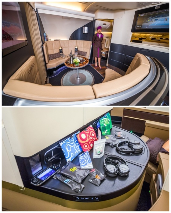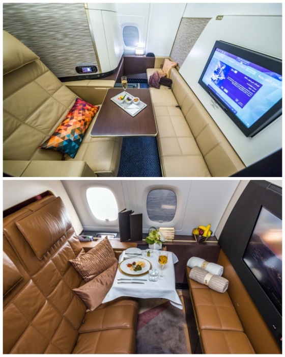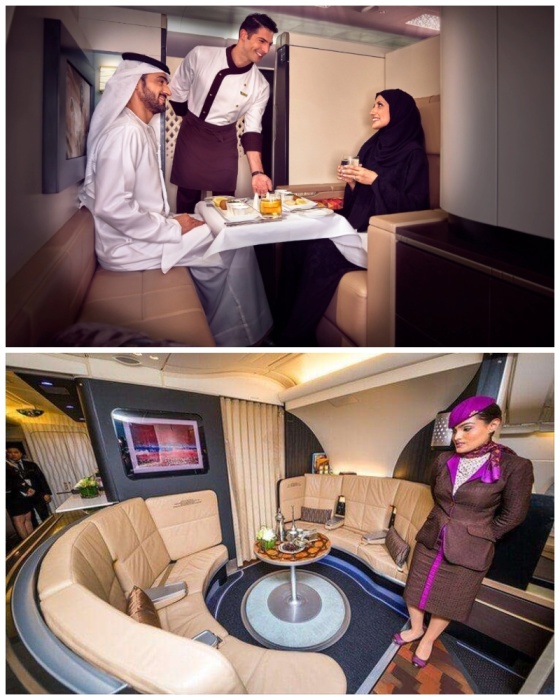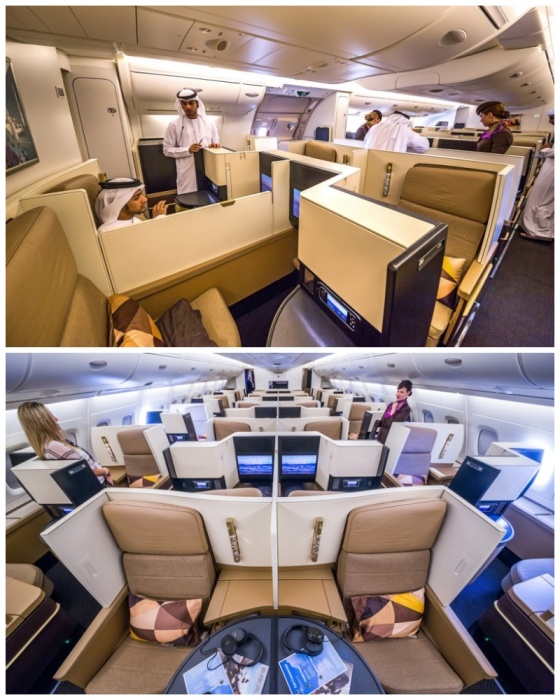 Зал для отдыха и одна из кабин с пассажирами первого класса (аэробус А-380). | Фото: top.funnyreps.club/ etihad.com.